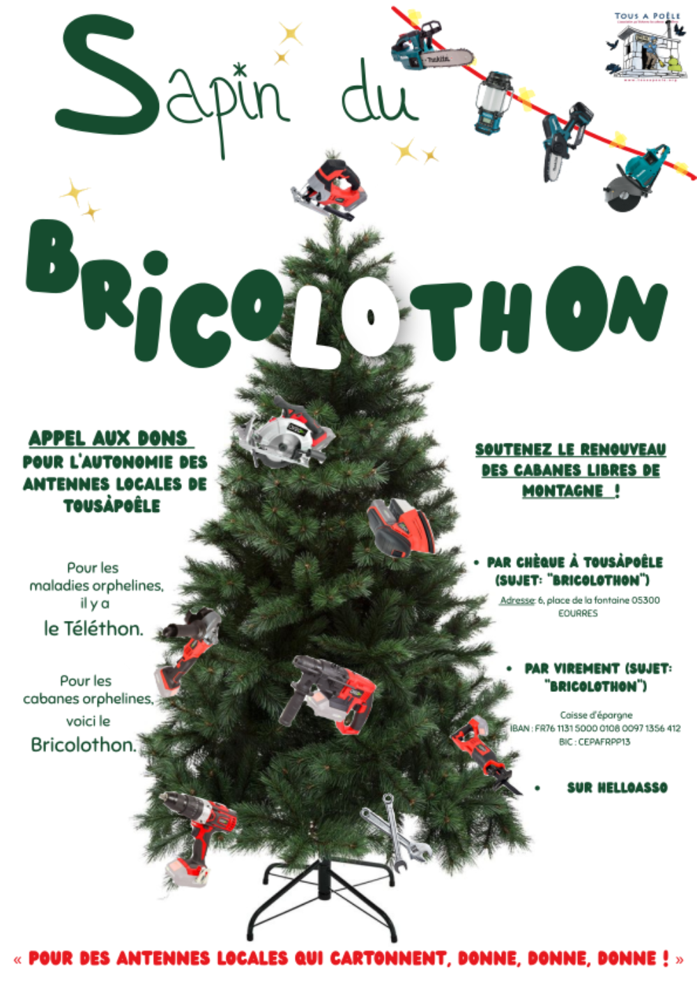 Le Bricolothon et ouvert jusqu’au 31 mars (après les sapins n’ont plus d’aiguilles). Il sera rendu compte dans un Écho des cabanes des dons reçus et de leur utilisation.
