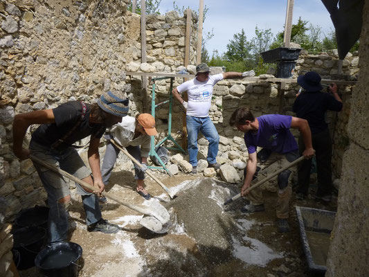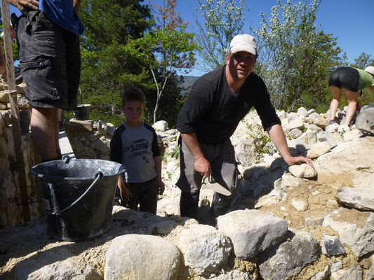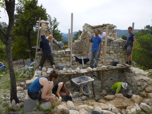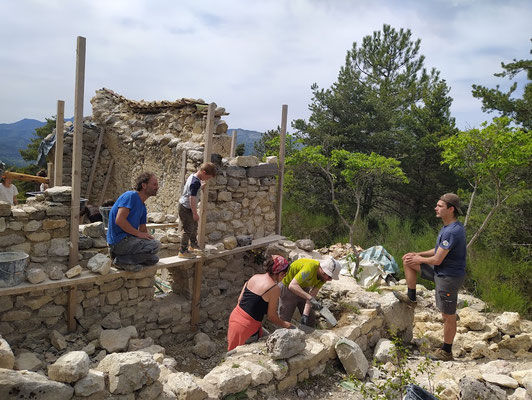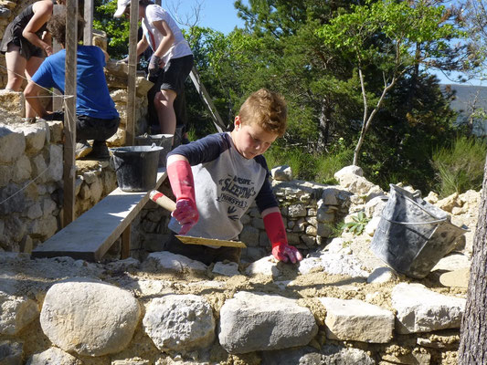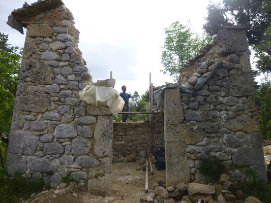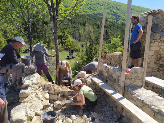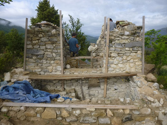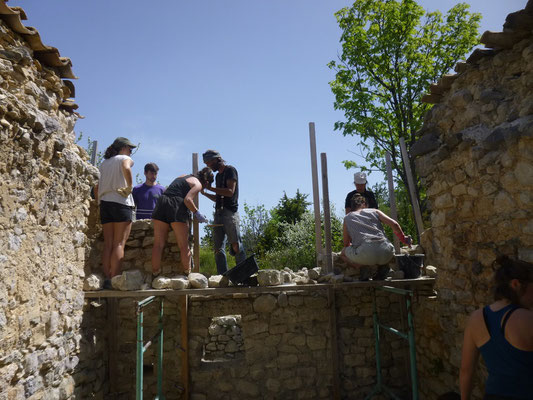 Cette fois, fini de tomber des arbres et enlever des pierres menaçantes, on passe à une nouvelle étape du chantier : on rebâti ! le mur du fond s'élève, des tours de fenêtres se ferment, bref, ça commence à prendre forme !