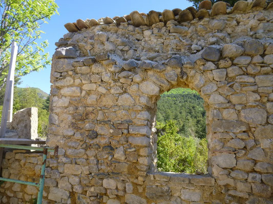 construction est bien endommagée mais reste - entre autres - ses beaux tours de fenêtres en tuf et quelques pans de murs.