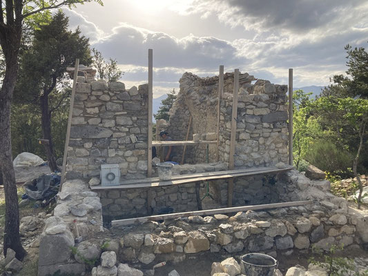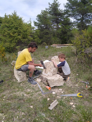 On repose les tours de fenêtres, on taille de la pierre, on construit des tables et, pour changer, on empile des pierres pour continuer des monter des murs : pour le détails, yeutez les photos !