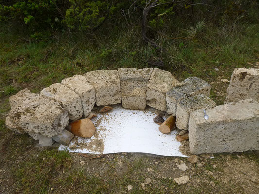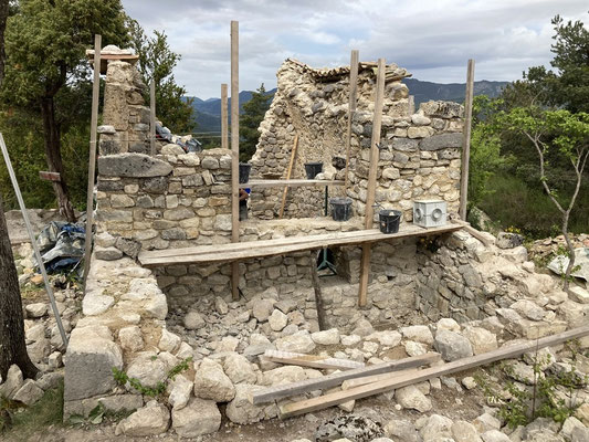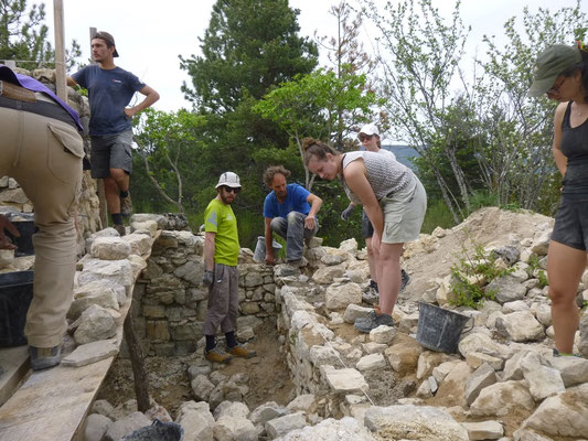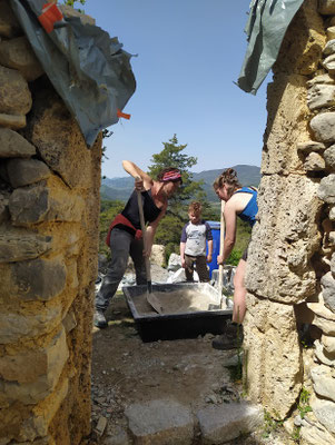 Fin de l'ouverture du chemin d'accès, déblayage autour de la chapelle, installation d'une cuve alimentée par un impluvium, quelques greffes d'arbres fruitiers, fabrication et pose de panneaux, voilà à quoi a été consacré ce 2e chantier.