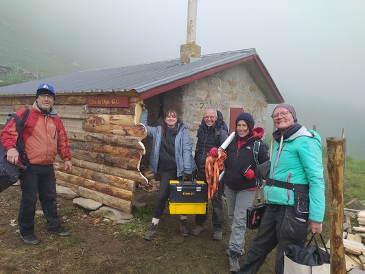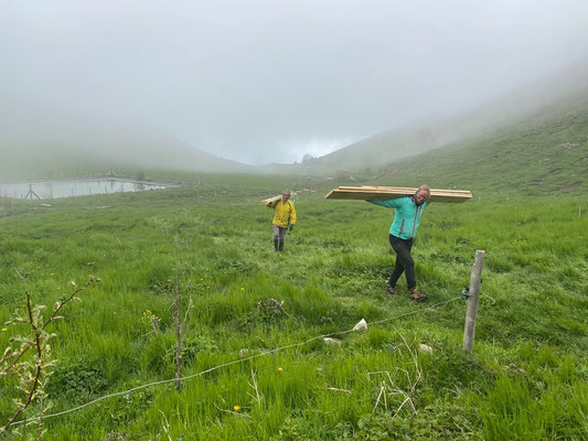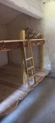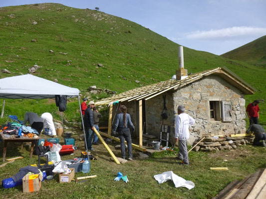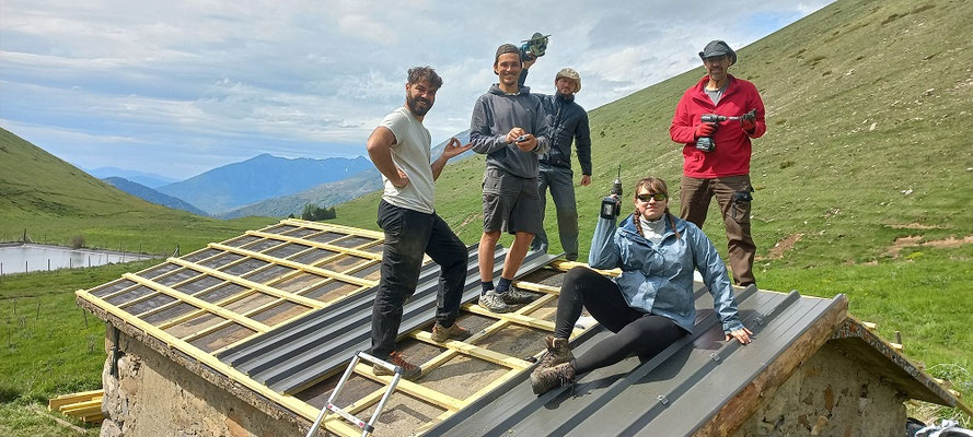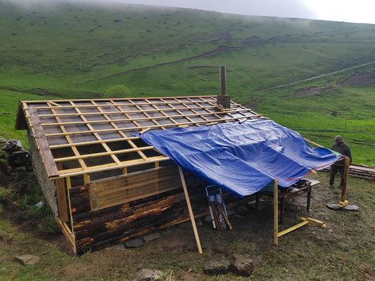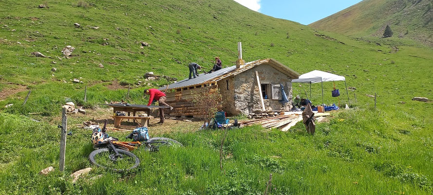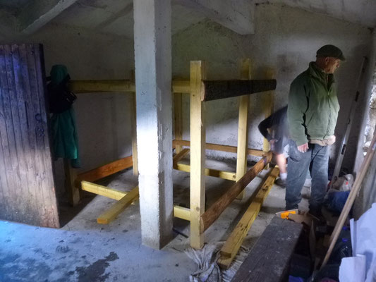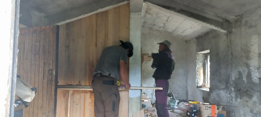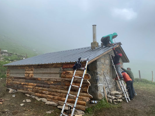 Mai 2025 : Chantier de bichonnage et construction (appentis, bas-flancs et étagère intérieurs, installation et raccordement du poêle, réfection de la toiture)