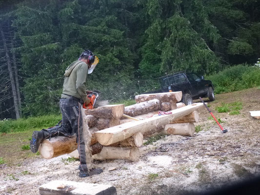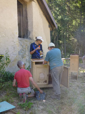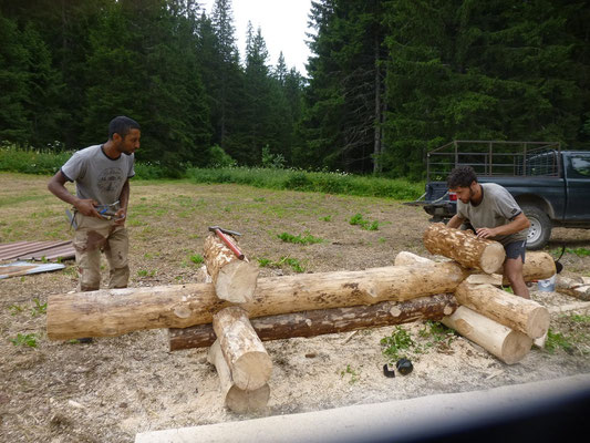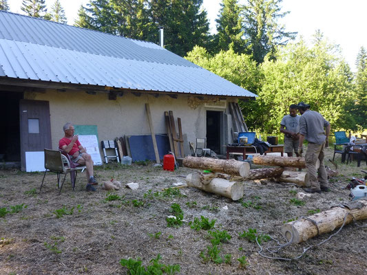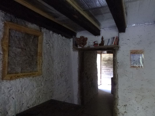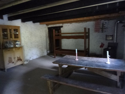 Intérieur : C'est immense ! Une grande pièce +- vide / la pièce de vie avec poêle, table et bancs, vaisselier, 1 lit superposé / une chambre